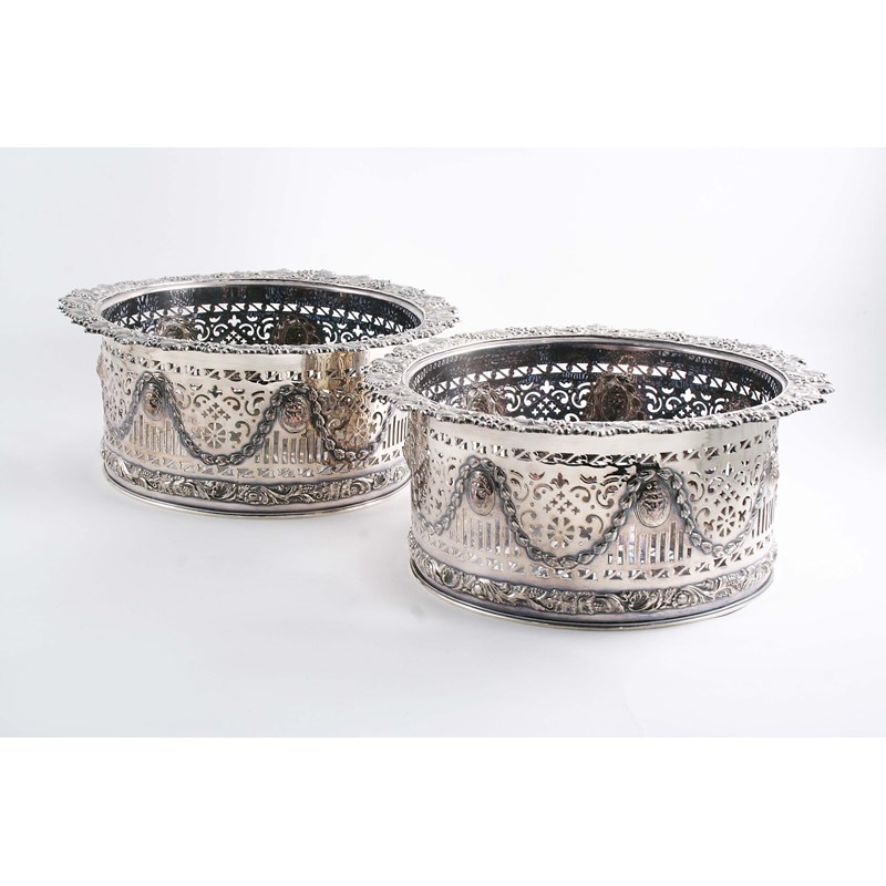A PAIR OF VERY LARGE LATE VICTORIAN ELECTROPLATED WINE COASTERS with pierced & embossed decoration and borders of fruiting vines, unmarked, c.1900; 10" (25.5 cms) diameter (2)