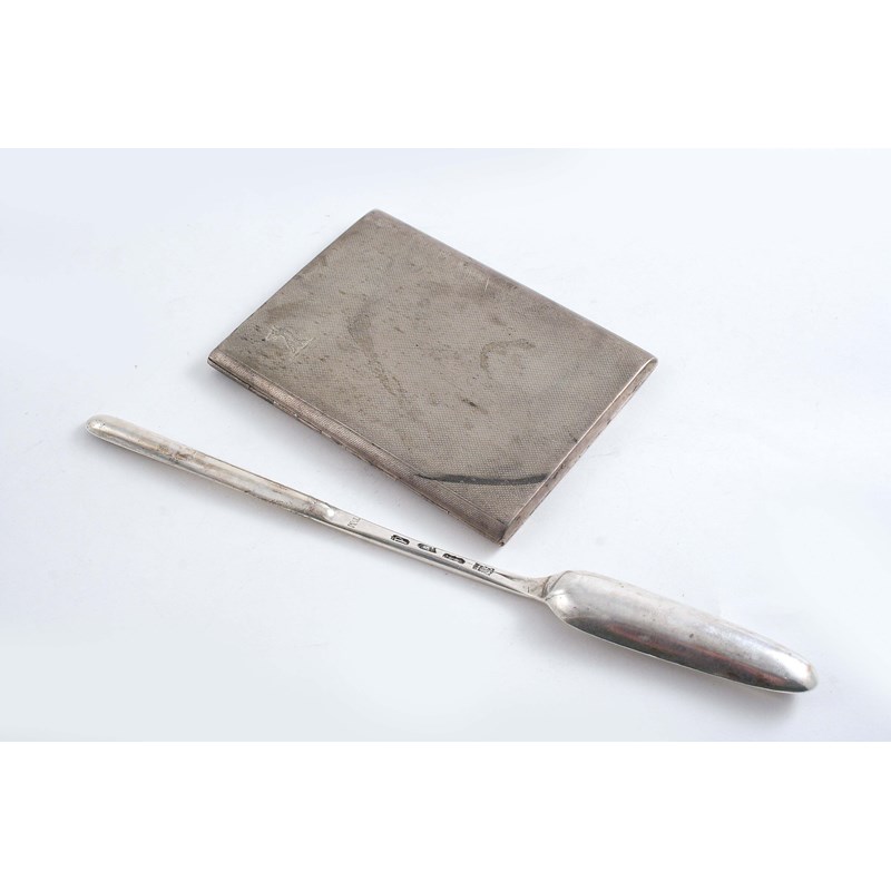 initialled "TM" on the back of the stem, by George Smith, London 1779 and a modern engine-turned cigarette case, crested & inscribed on the inside; the scoop 8.8" (22.2 cms) long; 66 oz (2)