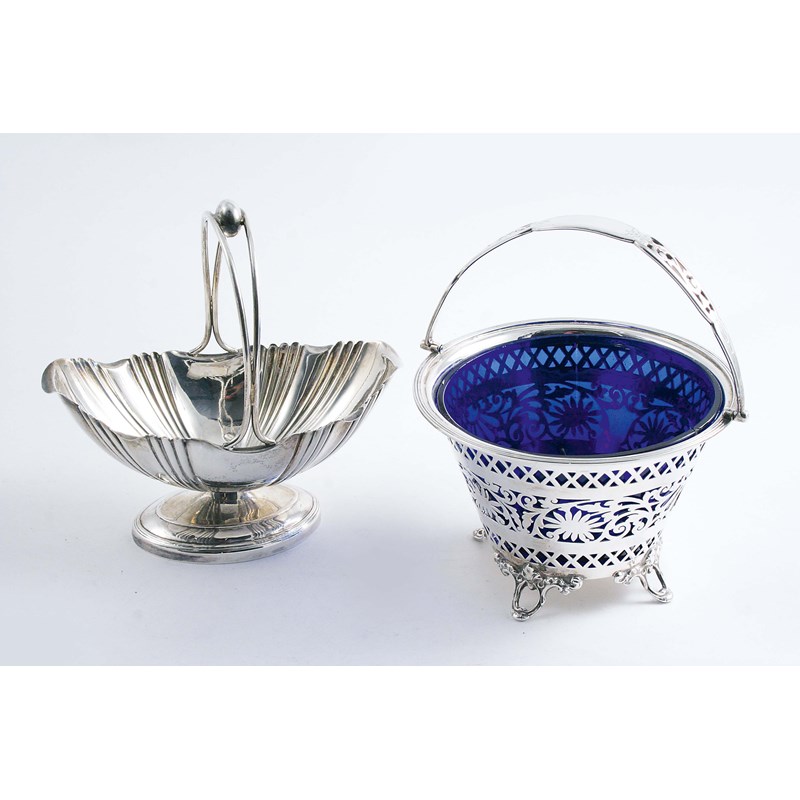 A late Victorian boat-shaped sugar basket by Walker & Hall, Sheffield 1894 & a pierced sugar basket with a blue glass liner, by H. Atkin, Sheffield 1901; the latter 5.5" (14 cms) diameter; 12.2 oz weighable silver (2)