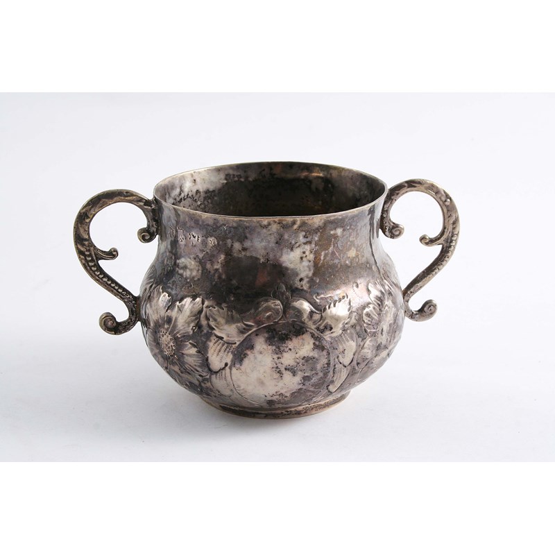with an embossed baluster body & two cast, s-scroll handles, each side with a vacant circular cartouche, struck four times below the rim with a shield shaped mark with pellets, probably provincial 1670-1680; 3.25" (8.3 cms) high