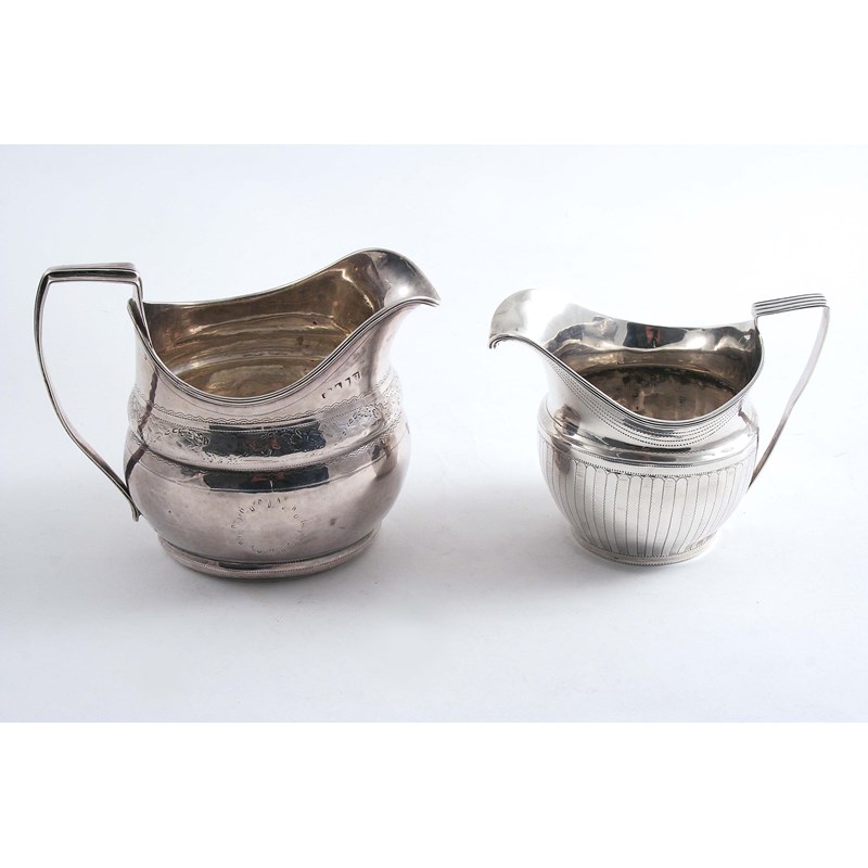 oval with engraved decoration, initialled "O" over "IM" on the base, marks partially worn, Dublin 1804 and a smaller George III cream jug with pricked engraving, maker's mark worn, London 1804; the latter 3.4" (8.6 cms) high; 8.8 oz (2)