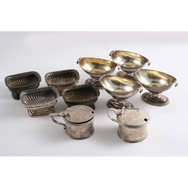 A set of four George III oblong salts on low pedestal bases with part-fluted decoration, crested, by R. Emes & E. Barnard, London 1811, a set of four pedestal salts with bead borders & navette-shaped bodies, crested, gilt interiors, by Robert Hennell, London 1788 (with lead loading), and two 19th century drum mustard pots (glass liners); the latter 2.5" (6.4 cms) high; 21.8 oz weighable silver (10)