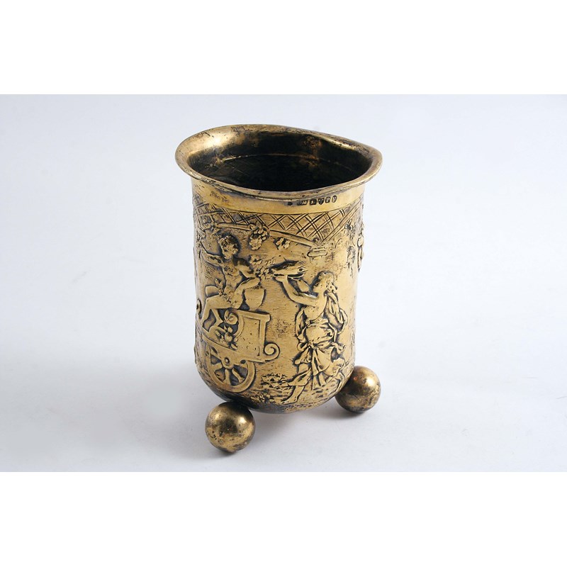 A LATE 19TH CENTURY CONTINENTAL SILVERGILT BEAKER on ball feet with embossed decoration & English import marks for Chester 1898; 5" (12.7 cms) high; 7.25 oz
