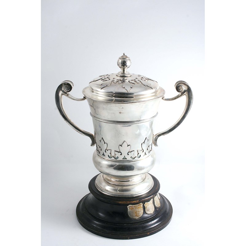with two harp-shaped handles, cut-card decoration & a bud finial, engraved on one side with a presentation inscription & the title "ARMISTILE CUP", with mounted, ebonised wooden plinth by J.B. Carrington for Carrington & Co., London 1904; 14.25" (36 cms) high; 93.6 oz