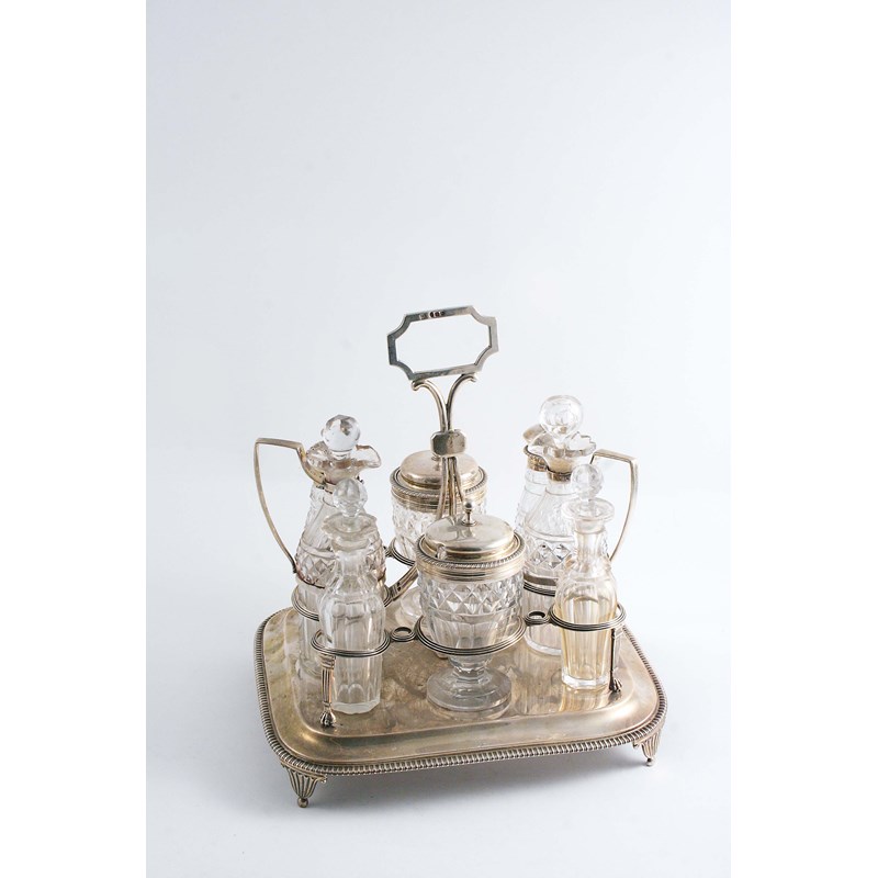 with a gadrooned rounded oblong base and fluted bracket feet, fitted with six mounted cut-glass bottles and two non-matching cut-glass bottles with stoppers, the mounts & frame by D. Urquhart & N. Hart, London 1808; 11" (28 cms) high; 32.5 oz weighable silver