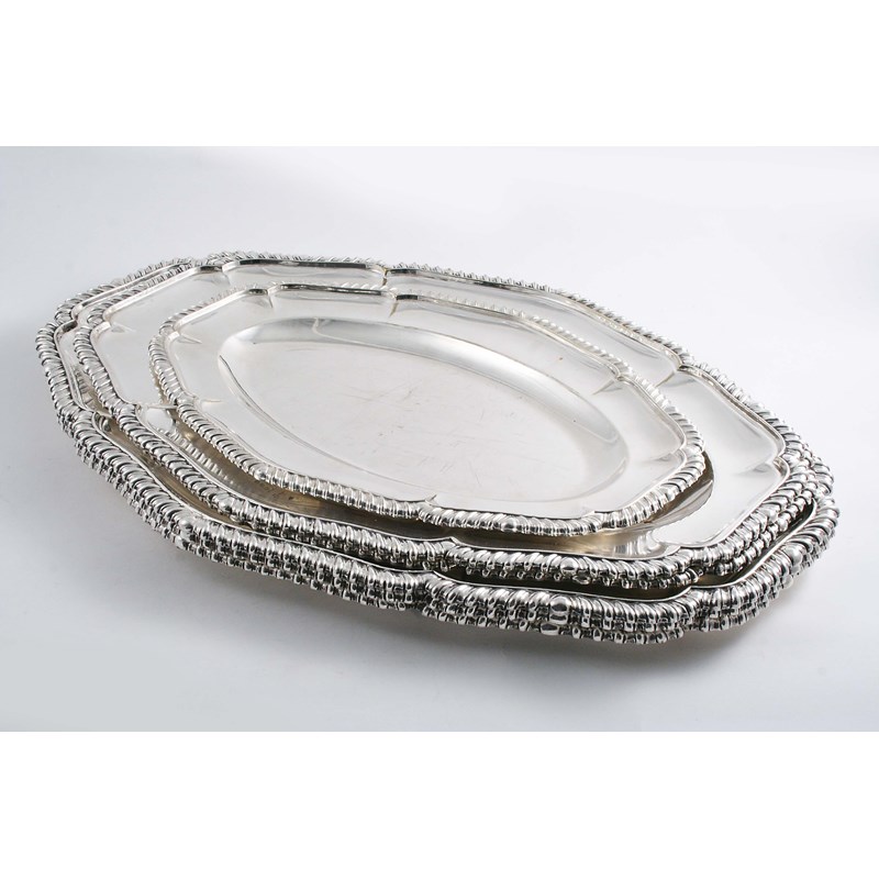 A LATE VICTORIAN ELECTROPLATED GRADUATED SET OF MEAT DISHES; three large, two smaller & one small, each with a shaped oval outline & a gadrooned border, c.1900; the largest ones 20.25" (51.5 cms) long (6)