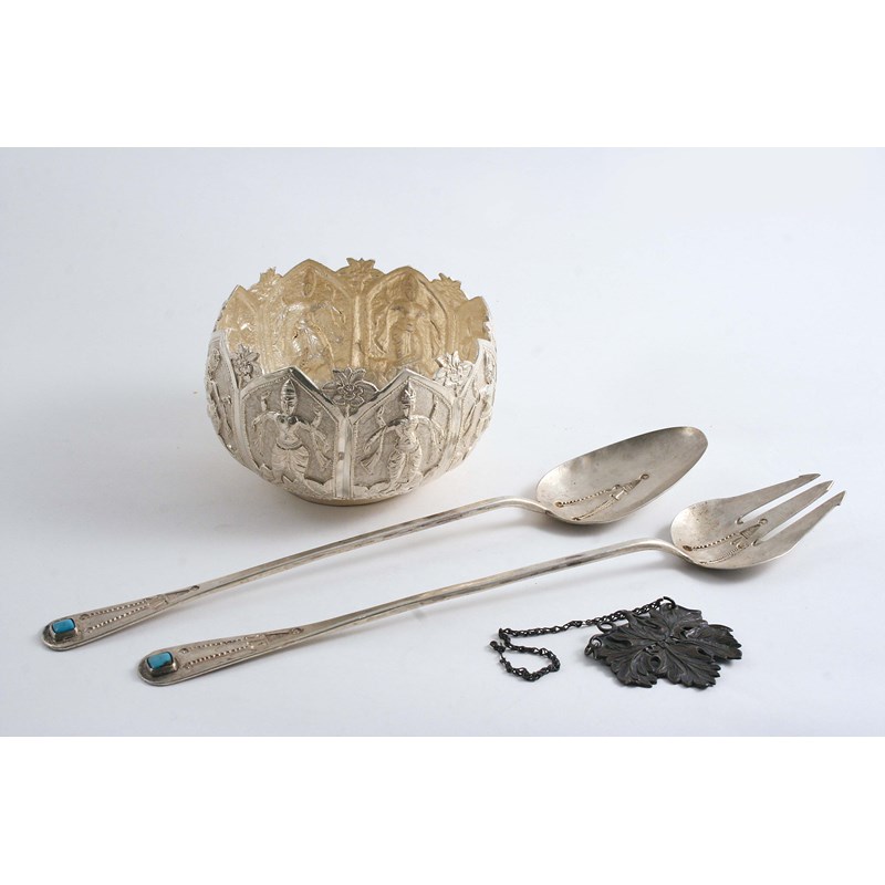 with embossed figural decoration & a shaped rim, a pair of modern salad servers (probably Mexican) and a Victorian vine leaf wine label pierced "RUM" by George Unite, Birmingham 1840; the bowl 4.5" (11.5 cms) diameter; 8.6 oz (4)