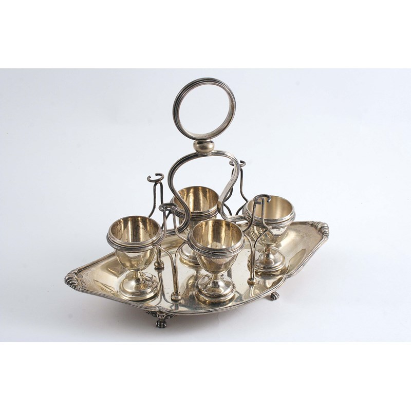 A BOAT-SHAPED EGG FRAME with reeded superstructure, ring handle & four lift-off egg cups, monogrammed, by the Alexander Clarke Manufacturing Co.,Birmingham 1912; 9.8" (25 cms) long
