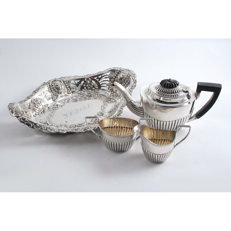 with part-fluted oval bodies, by J.M. Banks, Birmingham 1897 and an Edwardian embossed fruit dish, initialled, by Messrs. Reid, Langford & Reid, London 1905; the dish 12" (30.5 cms) long; 21.6 oz (4)