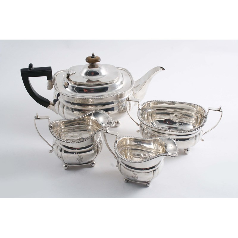 with rounded oblong bodies, angular handles, gadrooned borders & ball feet including:- tea pot, sugar bowl, cream jug & milk jug, each with an engraved armorial, by Charles Smart Harris & Sons, London 1911/12; the tea pot 6.2" (15.6 cms) high; 33 oz (4)