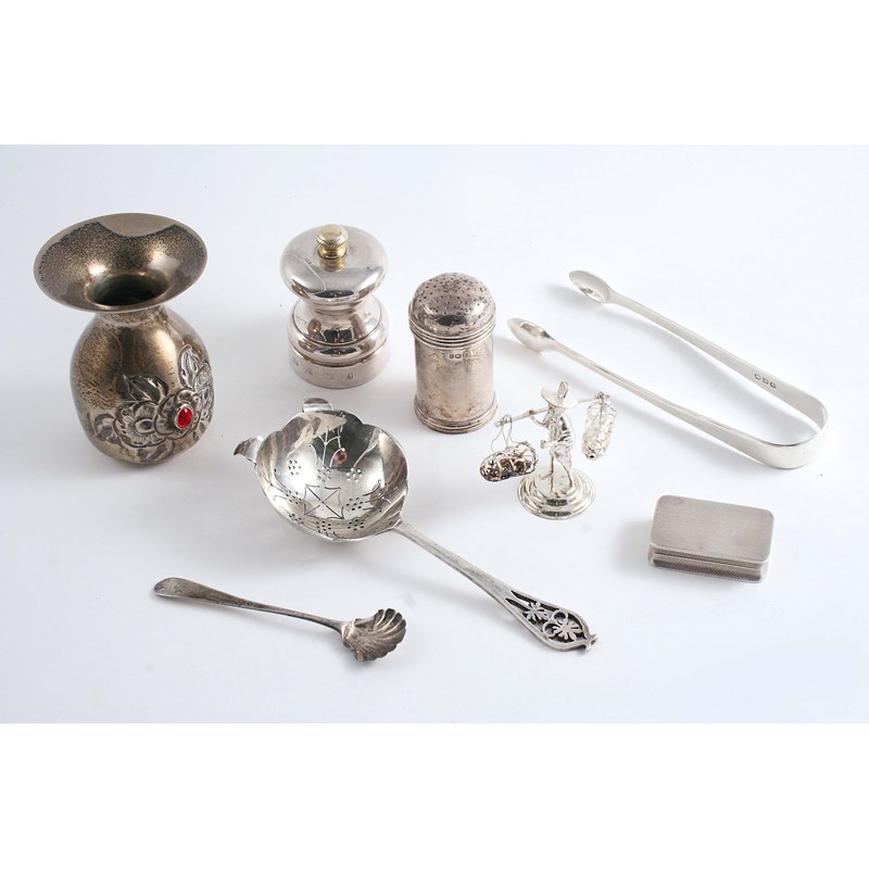 A tea strainer, a pair of antique sugar tongs, a George III salt spoon, a pepperette, a pill box, a mounted pepper mill, a small Continental vase & a small Chinese figure; the latter 2.25" (5.7 cms) high; 8.7 oz weighable silver (8)