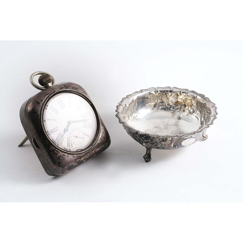 fitted with a nickel "Goliath" pocket watch, the frame by Mappin Bros. London 1901 and a Victorian embossed sugar bowl; the latter 4.75" (12 cms) diameter; 3.7 oz weighable silver (2)