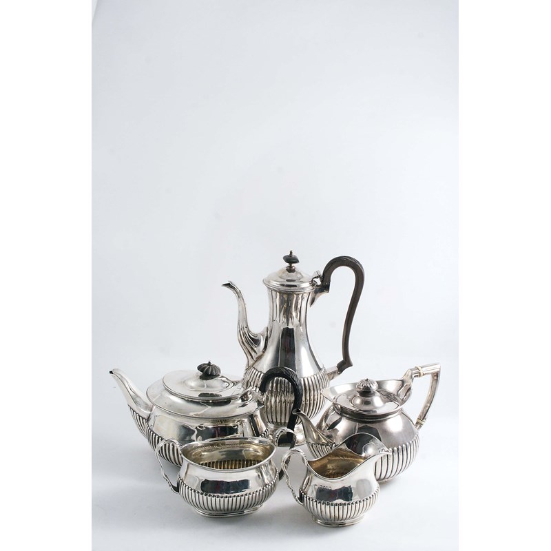 oval with part-fluted decoration, crested, and a baluster coffee pot of a similar form, all by F.B. McRea, London 1896/97 and a Victorian globular tea pot with part-fluting & a flared rim, crested, by Edward Hutton, London 1896; the coffee pot 10.5" (26.5 cms) high; 66.9 oz (5)