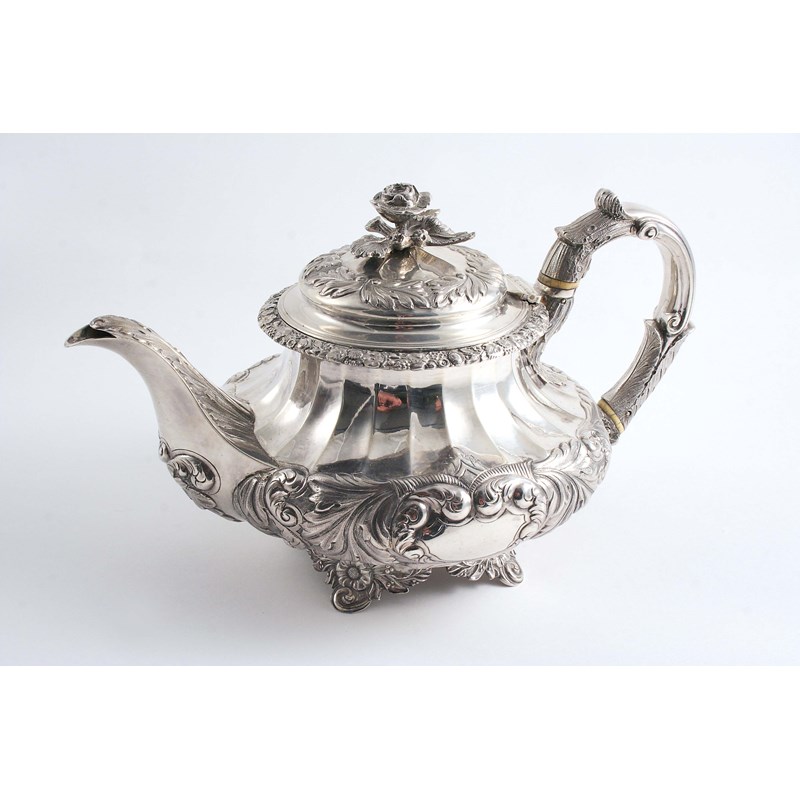 A GEORGE IV EMBOSSED TEA POT on four floral feet with a flower finial, a floral border & two vacant cartouches, by Richard Pearce & George Burrows, London 1826; 6.75" (17.2 cms) high; 27 oz