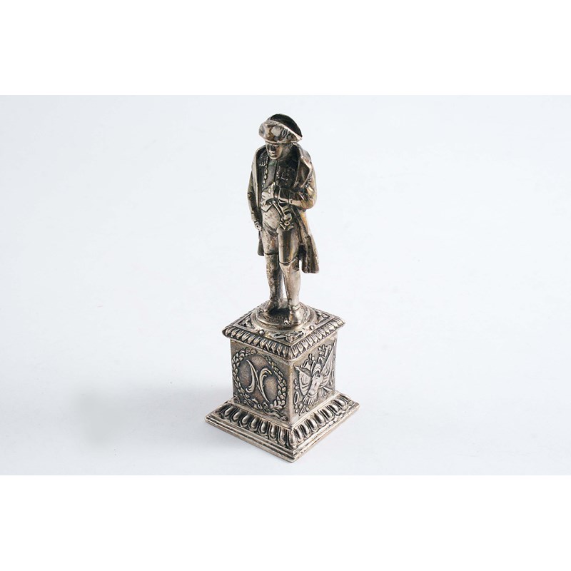 A CONTINENTAL CAST FIGURE OF NAPOLEON on a bevelled square plinth, with English import marks for London 1906; 4.5" (11.5 cms) high; 3.3 oz