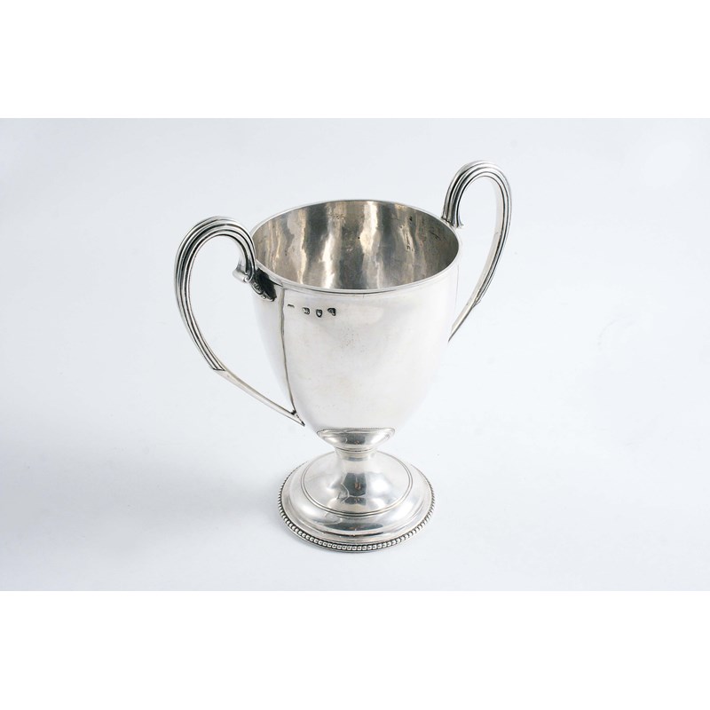A GEORGE III TWO-HANDLED CUP on a beaded pedestal foot, maker's mark only, partially struck, probably by John Denziloe, London 1776; 7.25" (18.5 cms) high; 15.25 oz