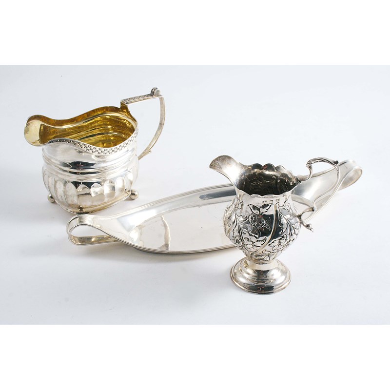 with loop handles, crested, by Henry Chawner, London 1787, a George III cream jug on ball feet, gilt interior and a George III embossed baluster cream jug, initialled; the tray 11.5" (29 cms) long; 12.3 oz (3)
