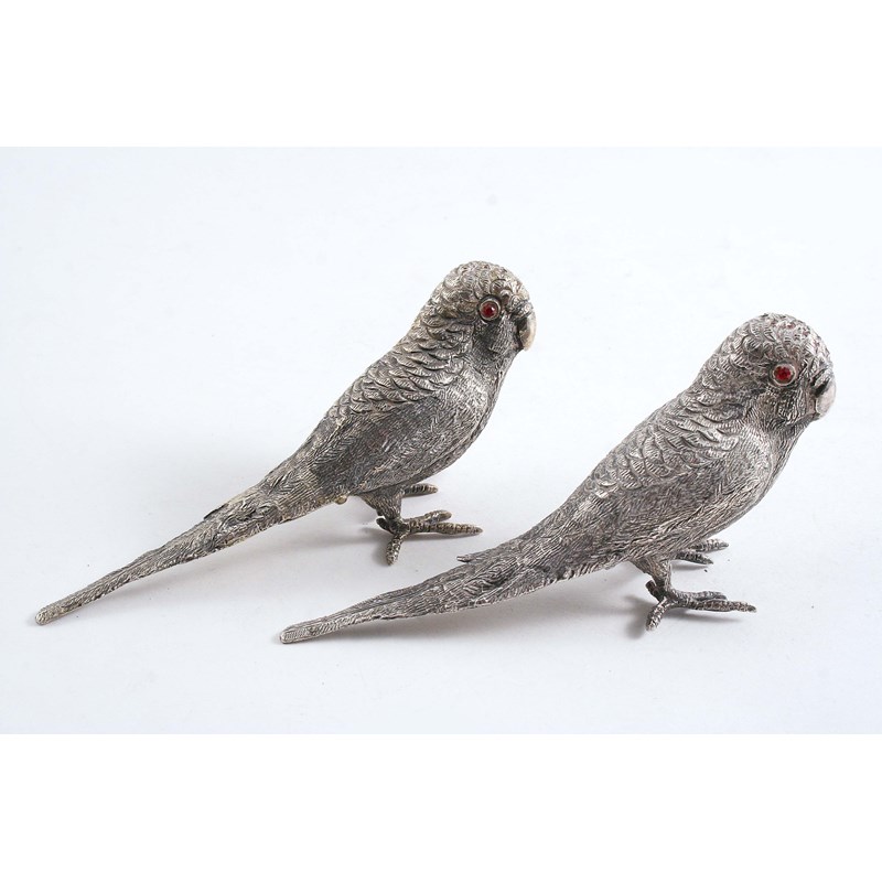 in the form of budgerigars with textured plumage, red glass eyes & a hinged flap under their tails (for filling), by George Brace, London 1905; 4.5" (11.5 cms) long; 4.5 oz (2)