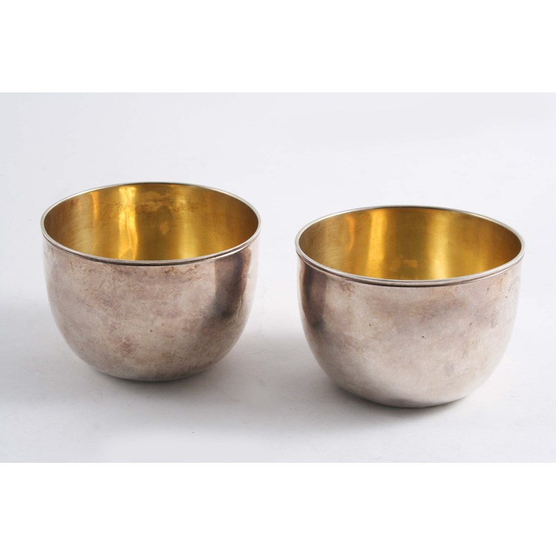 A PAIR OF EARLY GEORGE III SCOTTISH TUMBLER CUPS with gilt interiors, engraved on one side with a crest below the motto "I MEAN WELL", by John Clark, Edinburgh 1765; 3.4" (8.5 cms) diameter; 7.1 oz (2)