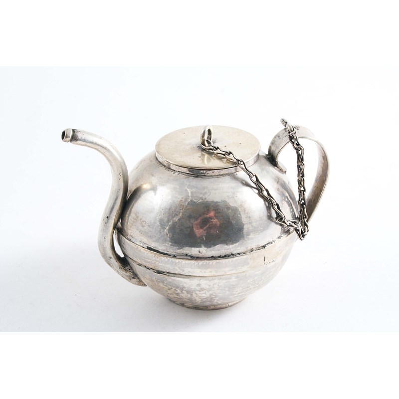 with a narrow tubular spout and detachable cover secured by a chain, unmarked, probably early 19th century, unascribed; 3.4" (8.5 cms) high; 6 oz