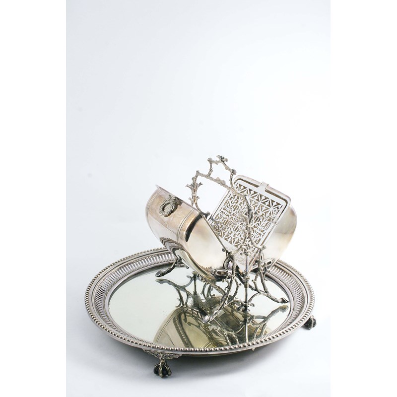 A Victorian salver with an inset mirror plateau, crested, and a Victorian patent biscuit box with two hinged compartments and a "rustic" frame; the latter 9.3" (24 cms) high (2)