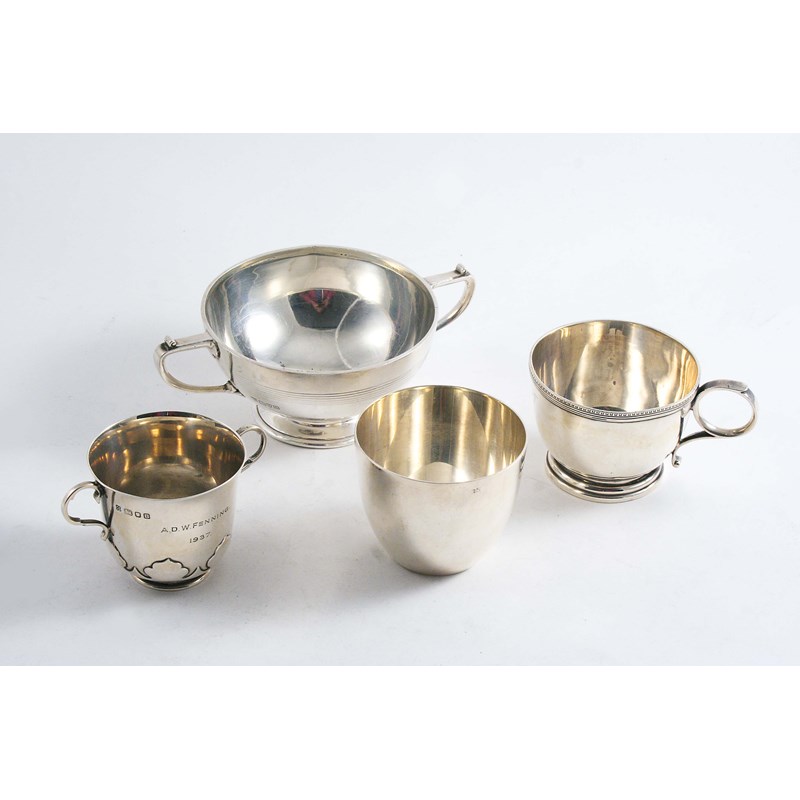 A MIXED LOT: A two-handled sugar bowl, a beaker inscribed with the "BP" logo, a small mug, inscribed and a small two-handled cup, inscribed; the latter 2.3" (6 cms) high; 16.3 oz (4)