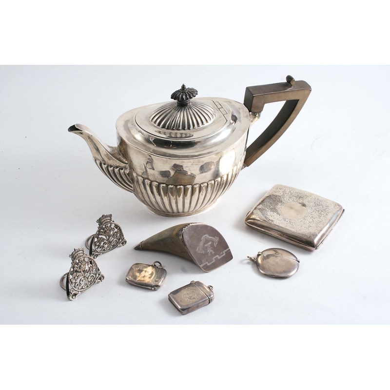 A Victorian part-fluted oval tea pot, maker's mark worn, London 1889, three various vesta cases (one initialled, one monogrammed), a pair of menu card holders, a cigarette case, and a 19th century mounted cow hoof snuff mull, crested, unmarked; the latter 4.25" (11 cms) long; 21.4 oz weighable silver (8)