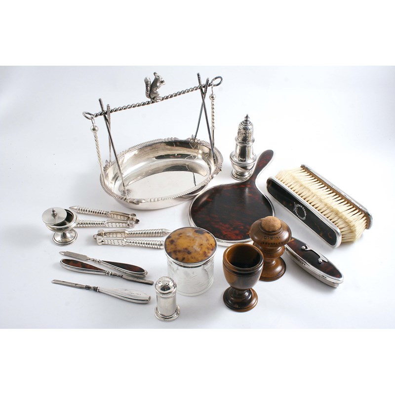 Two pepperettes, eight various mounted tortoiseshell items, a small pedestal powder compact with lift-off cover, an olive wood pin cushion & egg cup from Jerusalem and a plated nut dish with a squirrel finial, two nut picks & two pairs of nut cracks; the nut dish 8.2" (20.6 cms) long (lot)