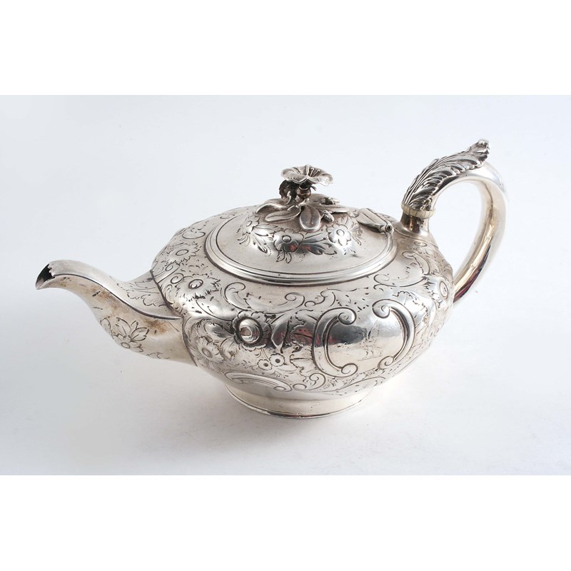 AN EARLY VICTORIAN TEA POT circular with embossed decoration, a ring foot & a flower finial, crested, by John Wrangham & William Moulson, London 1837; 4.75" (12 cms) high; 17.1 oz