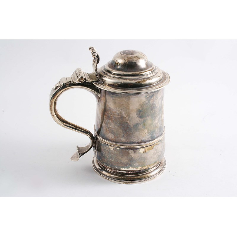A GEORGE II TANKARD with a tucked-in base & circular foot, a domed cover, moulded girdle & large scroll handle, initialled, by R. Gurney & T. Cooke, London 1734; 7.5" (19 cms) high; 25.6 oz