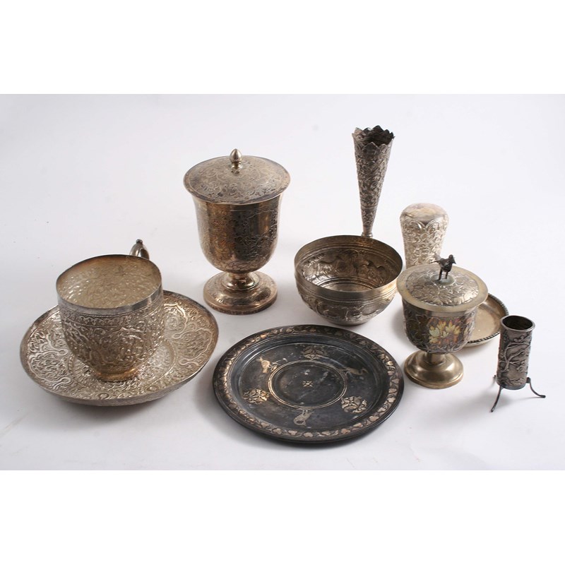 A 19th century Chinese goblet & cover with chased floral decoration, an Indian cup & saucer, a small Chinese vase on three legs, an inlaid steel saucer etc., an Indian vase etc.; the goblet 5.5" (14 cms) high; 23 oz weighable silver (lot)