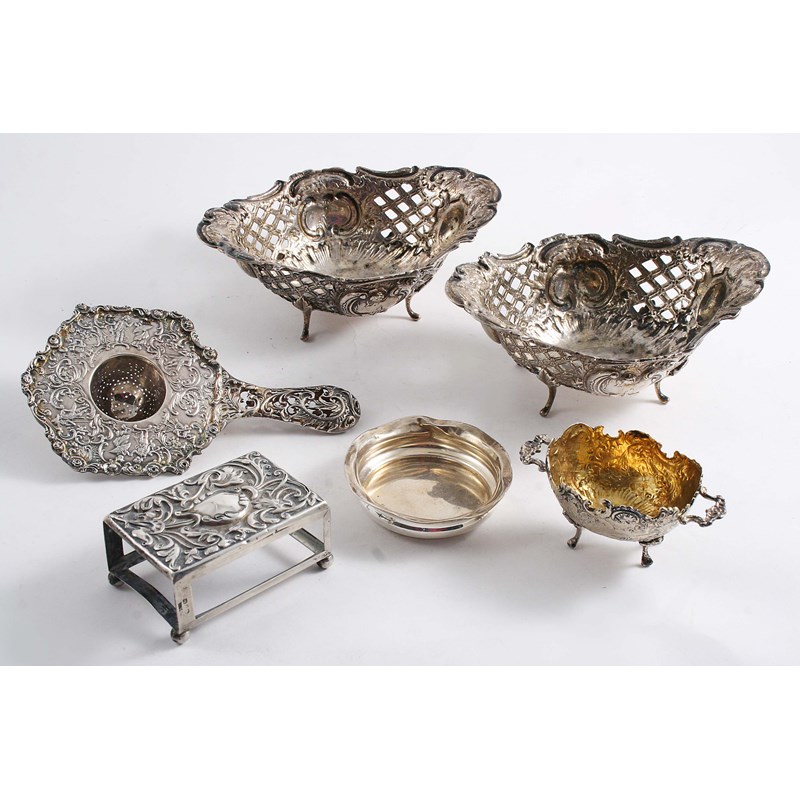A PAIR OF CONTINENTAL BONBON DISHES & A TEA STRAINER with English import marks, together with a matchbox holder & two small dishes; the bonbon dishes 6.3" (16 cms) long; 15.7 oz (6)