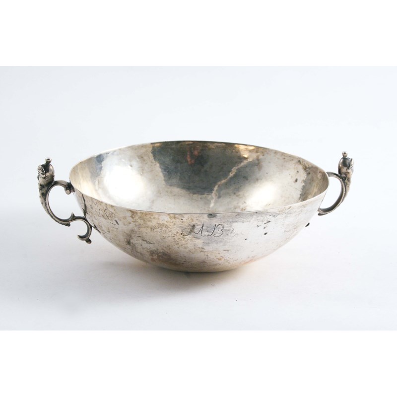 A SMALL SOUTH AMERICAN CUP with twin mask & scroll handles & a hemispherical bowl, initialled "MB", unmarked, probably late 18th century; 6.3" (16 cms) diameter; 6.6 oz