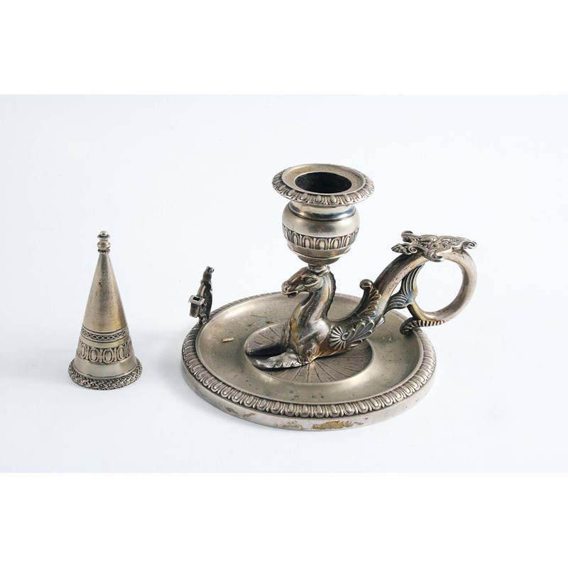 with detachable conical snuffer, maker's mark "FL" (with an animal), Milan 1810-15; 4.2" (10.5 cms) diameter