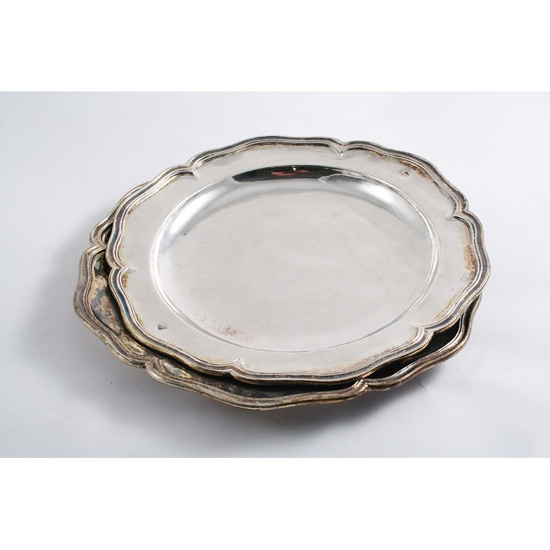 TWO SIMILAR LATE 18TH / EARLY 19TH CENTURY SPANISH COLONIAL DISHES of shaped circular outline; one struck twice with an incuse "crown" mark and inscribed "Domingo Sagastume" on the reverse; the other with three marks ("Guaerra", an incuse crown & a lion with mountains in a square punch), the reverse inscribed "Lopez Colom" and "Dn.Jose, Bent9.del Fiade", Guatemala 1780-1820; approx. 9.3" (23 cms) diameter; 29.3 oz (2)
