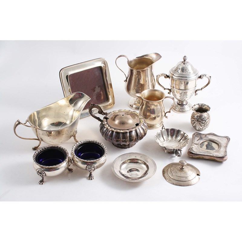 A modern sauce boat, a George IV squat, fluted mustard pot, a small two-handled trophy cup & cover, two cream jugs, two salts, two small frames, a small "Armada" dish etc.; the sauce boat 7" (17.8 cms) long; 36 oz weighable silver (lot)