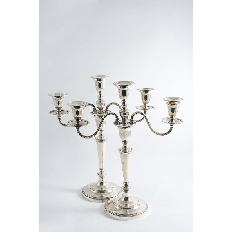 on round bases, with plain tapering columns, reeded scroll branches & detachable nozzles, by Nat Leslie, London 1957/59/60; 14.8" (37.8 cms) high; 70 oz (2)