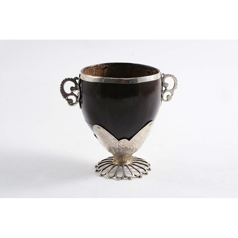 AN EARLY 19TH CENTURY SPANISH COLONIAL MOUNTED COCONUT CUP on a pierced foot with twin, small handles, initialled "RH", unmarked; 4.4" (11.2 cms) high