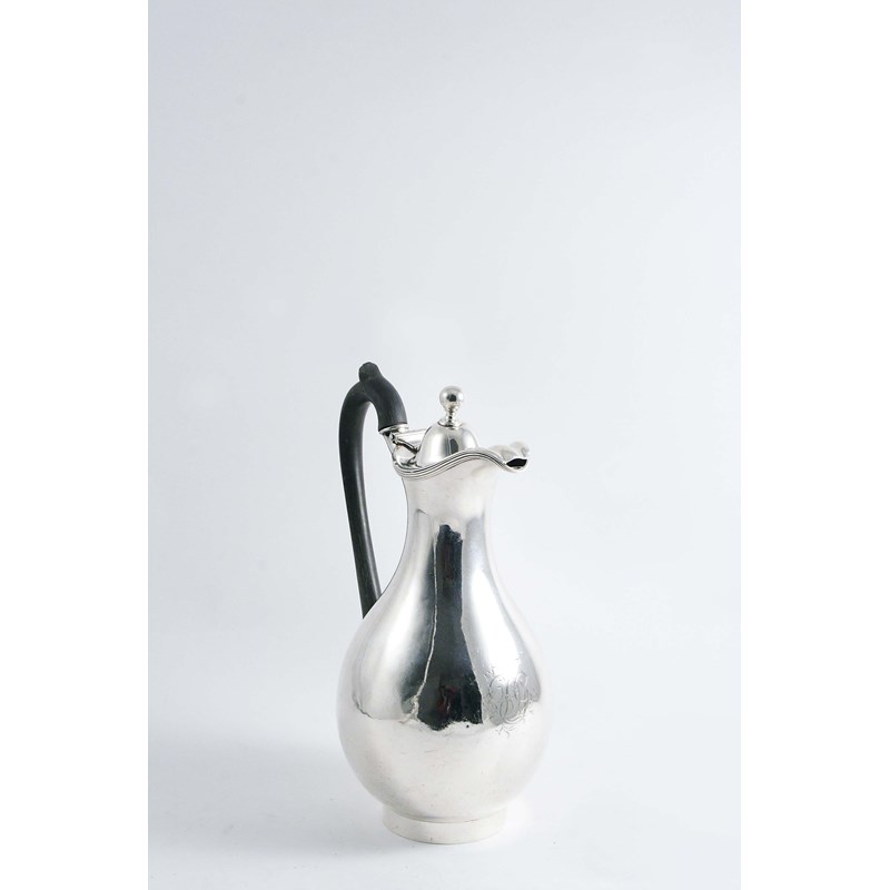 A George III baluster hot water jug on a collet foot, with a scroll handle, domed cover & ball finial, engraved with a crest & the initials "DG"*, London 1795; 10.25" (26 cms) high; 23.9 oz
