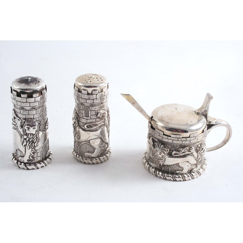 with mural details, crenellations & lions passant in relief around the sides (the mustard with a blue glass liner, gilt interior & spoon), maker's mark "AHE" or "AEH", London 1972; the casters 3.1" (8 cms) high; 21.4 oz weighable silver (4)