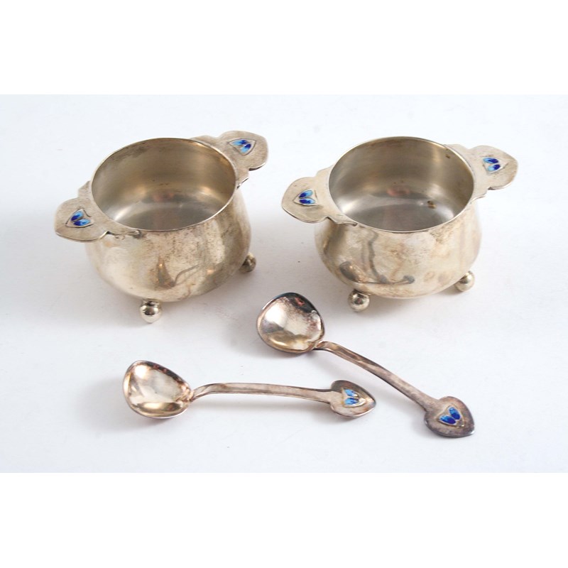 with enamelled decoration, maker's mark "J.F", Birmingham 1905; the salts 2.7" (6.8 cms) wide; 2.2 oz (4)