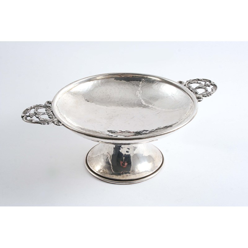 BY A.E. JONES: A modern handmade dish with twin cast handles, a shallow bowl and a trumpet foot, Birmingham 1919; 9.3" (23.2 cms) wide; 8.2 oz