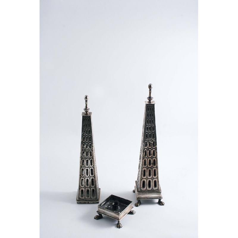 A PAIR OF UNUSUAL PORTUGUESE TAPER HOLDERS OR INCENSE BURNERS on small square tray bases with stylised paw feet & reeded borders, centred by a short cylindrical nozzle (to take a taper or incense stick), with lift-off obelisk-shaped shades or guard covers chased & pierced with horizontal rows of ovolos, graduated in size towards their tops, with turned screw-in finials, unmarked, 17th / 18th century; 12.9" (32.7 cms) high; 31.1 oz (2)