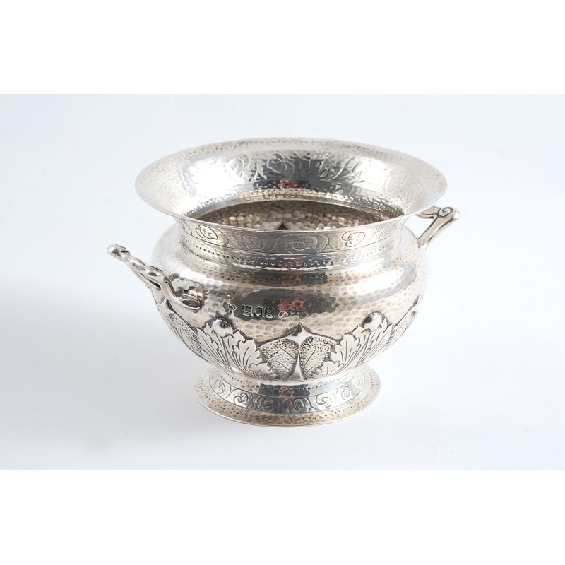 with a flared rim & foot, chased foliate decoration & a hammered finish, by Holland Aldwinckle & Slater, London 1902; 5.75" (14.8 cms) wide; 8.6 oz