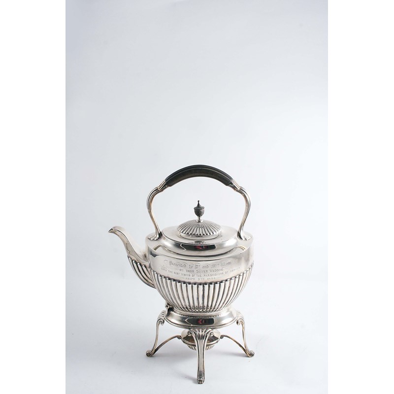 A LATE VICTORIAN KETTLE ON STAND with burner & part-fluted decoration, inscribed, by William Hutton & sons, London 1894; 14" (35.5 cms) high; 38.8 oz