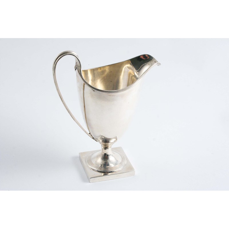 A GEORGE III PEDESTAL CREAM JUG with a square base, reeded borders & a loop handle, by Crispin Fuller, London 1793; 5.9" (15 cms) high; 4.1 oz