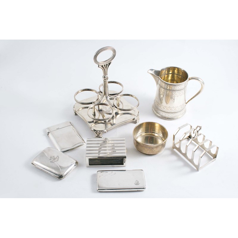 A George IV cruet frame, crested, a small toast rack, a card case, a cigarette case, crested, a matchbox holder, another card case, crested, a small circular bowl, and a Victorian engraved cream jug, various makers & dates; the latter 3.75" (9.5 cms) high; 27.7 oz