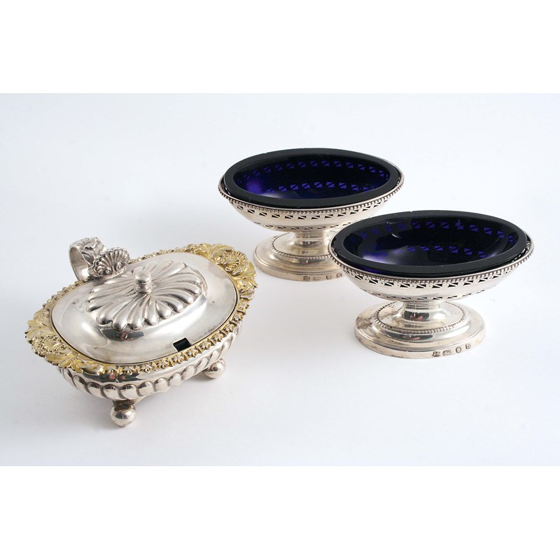 on oval pedestal bases with bead borders & glass liners, initialled, by Thomas Pratt & Arthur Humphreys, London 1783 and a George IV part-fluted mustard pot on ball feet with gilt interior & blue glass liner, by Richard Pearce, London 1823; the latter 4.3" (11 cms) wide; 9.1 oz weighable silver (3)