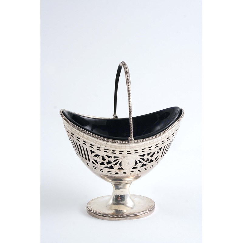 with bead borders, pierced & engraved decoration and a blue glass liner, initialled "J" on one side, by Thomas Pratt & Arthur Humphreys, London 1783;  5.75"  (14.5 cms) wide;  6.25 oz weighable silver