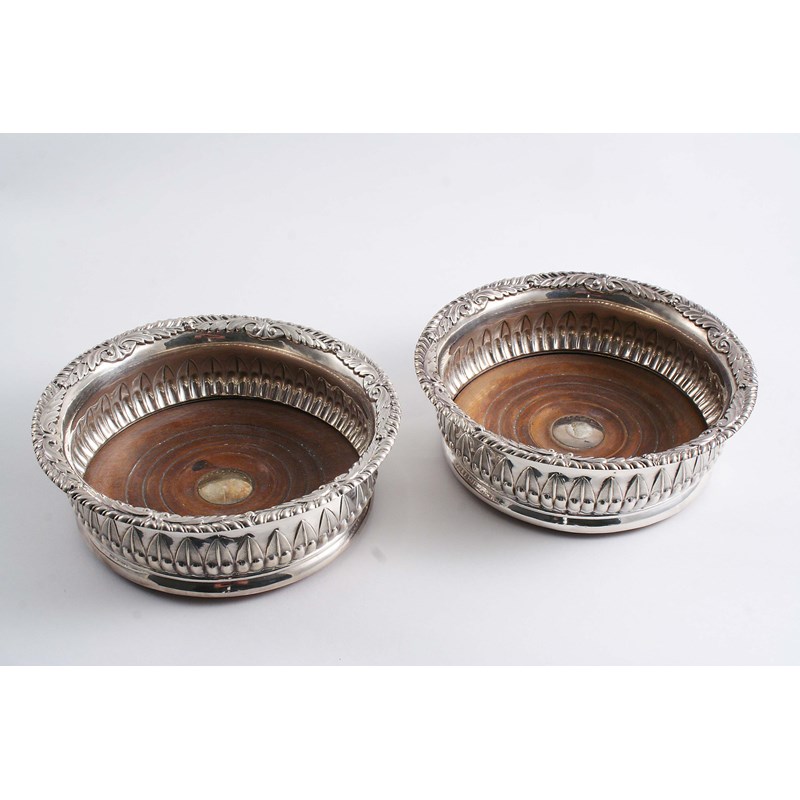 with gadroon & foliate borders & turned wooden bases with inset central bosses, the sides with a repeating pattern of arrowheads & part fluting, by John Roberts & Co., Sheffield 1826;  6.25"  (15.8 cms) diameter  (2)